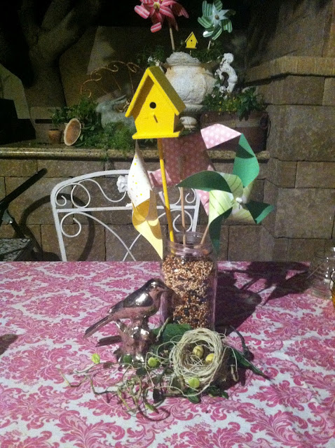 I loved the centerpiece that my mom came up with. Pinwheels and a Bird house inside a mason jar with bird seed! LOVED IT!