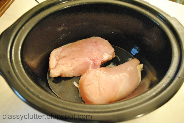 First, I sprayed my crock pot with cooking oil spray to make the clean up much easier. Place thawed chicken breasts in the crock pot.