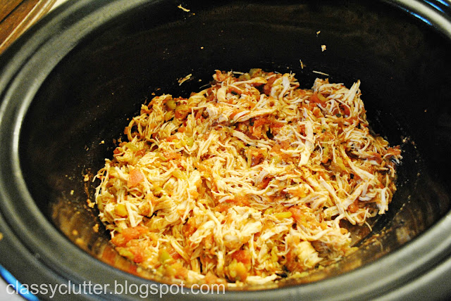 Add the salsa, green chilis, and taco seasoning and mix everything thoroughly. Cook on high for 6 hours. Drain any excess liquid that may have pooled around the bottom of the mixture after it is cooked thoroughly. Then, shred the chicken with a fork. I add another cup of salsa at this point once it is all shredded, this is optional. Then, mix it all up again.