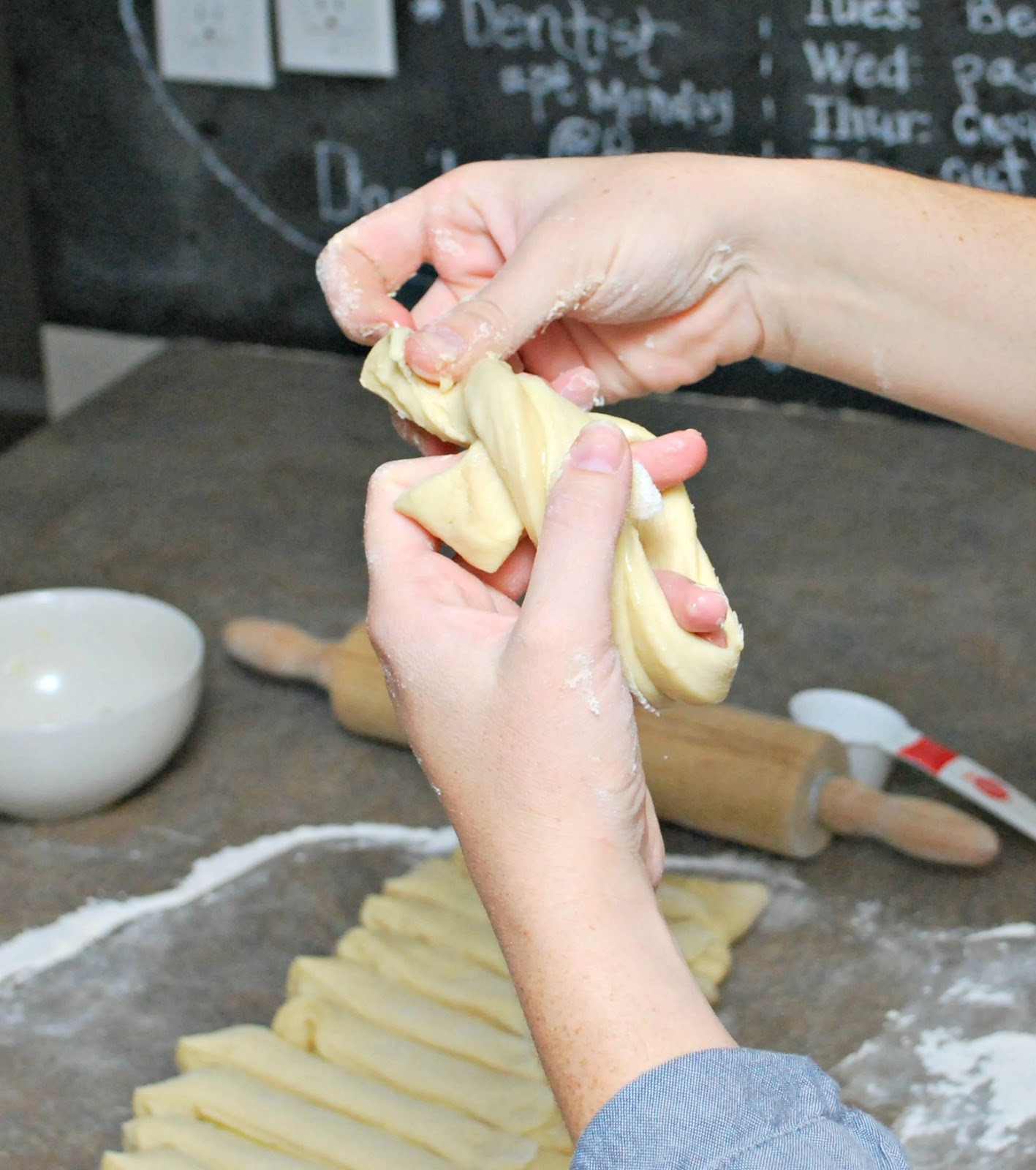 Let rise for 1 hour. The dough will not rise a ton but you should notice it rise a little bit. Roll out in a rectangle and cover with butter. Fold over in thirds and cut in 1 inch strips. Tie rolls into a knot and put on cookie sheet (12 rolls per sheet)
